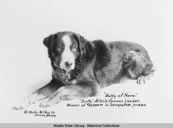 In 1907, the dog drivers in Nome banded together to form the Nome Kennel Club to improve the care and breeding of sled dogs. Around this same time Scotty reputedly purchased a sled dog named Baldy from a young boy who could no longer afford to care for him. As Scotty wrote in his autobiography, Gold, Men and Dogs, he was one of the founders of the All-Alaska Sweepstakes, the first organized sled dog race, which ran from Nome to Candle, a distance of 408 miles, from the shore of the Bering Sea to the shore of the Arctic Ocean