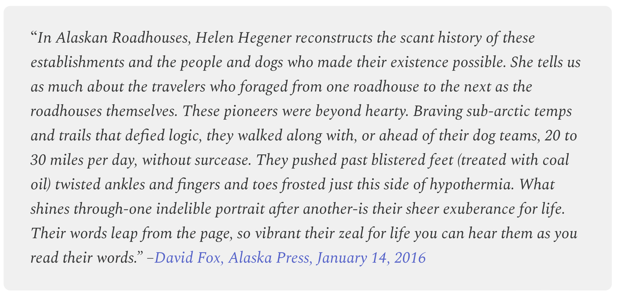 Alaskan roadhouses are a colorful reminder of the state’s past, and many are still an important part of Alaska’s transportation network. Alaskan Roadhouses: Shelter, Food and Lodging, by Helen Hegener, shares the history, photographs, and other information about these iconic Alaskan structures. It’s a great book to have on hand when traveling around Alaska this summer!