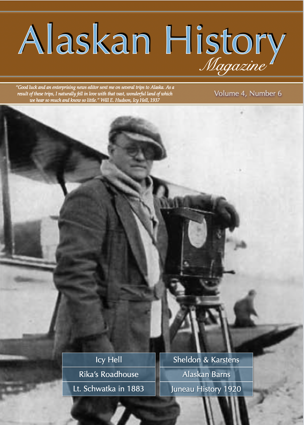 Volume 4, Number 6 — Icy Hell by W. E. Hudson • Charles Sheldon and Harry Karstens at Denali National Park • Rika’s Landing Roadhouse • Travels of Lt. Schwatka • Alaskan Barns • Juneau in 1920.