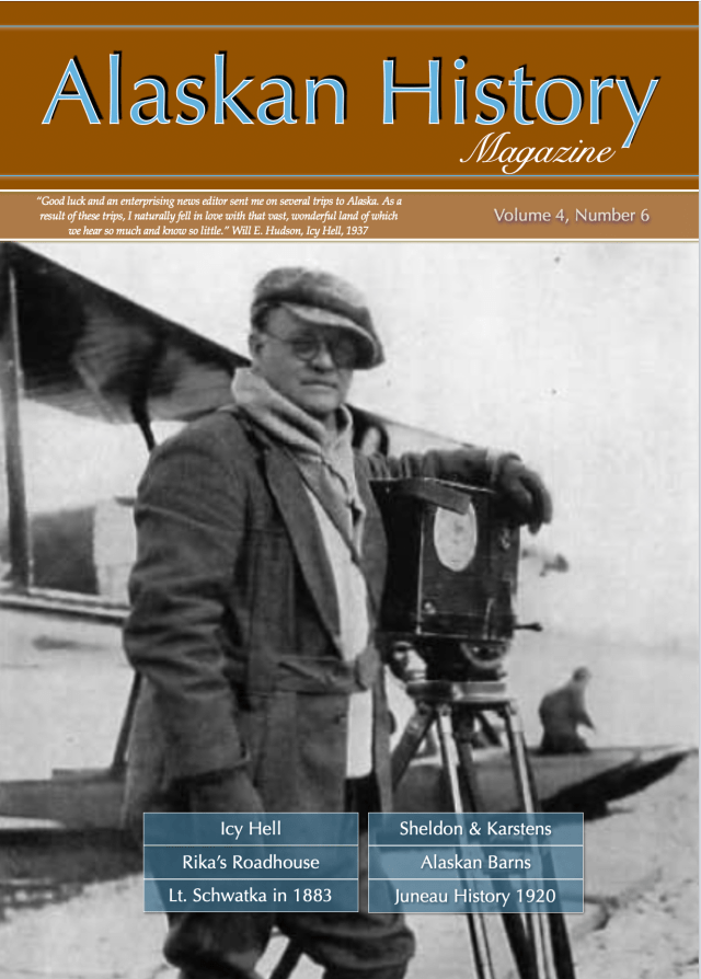 Current Issue: This issue, Volume 4, Number 6, features an excerpt from Will Hudson’s classic 1937 book ‘Icy Hell,’ detailing the harrowing overland journey he and several others made across the Brooks Range to the village of Fort Yukon when their ship ‘Polar Bear’ was trapped in the polar ice pack in 1913. Other articles in this issue include the friendship of Charles Sheldon and Harry Karstens and the founding of Denali National Park, the history of Rika’s Landing Roadhouse, the travels of Lt. Schwatka on the Yukon River, the history of barns in Alaska, and a 1920’s view of the capital city of Juneau.