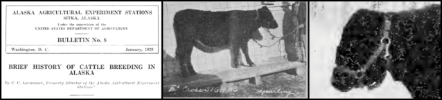 The history of cattle breeding in Alaska was the subject of a report written by C. C. Georgeson, Director of the Alaska Agricultural Experiment Stations, in 1929. He wrote about the Russians maintaining “a considerable number” of cattle at Kalsin Bay, on Kodiak Island, and noted later developments after the purchase of Alaska: