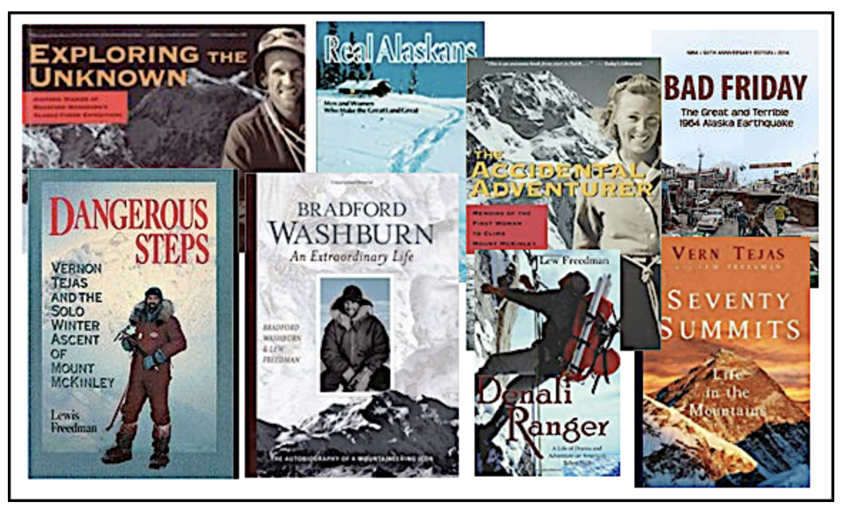 Lew also wrote books with the noted adventurer and explorer Bradford Washburn, and co-authored an autobiography with Barbara Washburn, the first woman to climb Denali (then Mount McKinley) in 1947. He wrote books about Vernon Tejas, the first man to ascend Mount McKinley alone in winter; Lowell Thomas, Jr.’s adventures around the world; the 1964 Alaska earthquake, and fishing Alaskan rivers such as the legendary Kenai, in pursuit of the great king salmon.