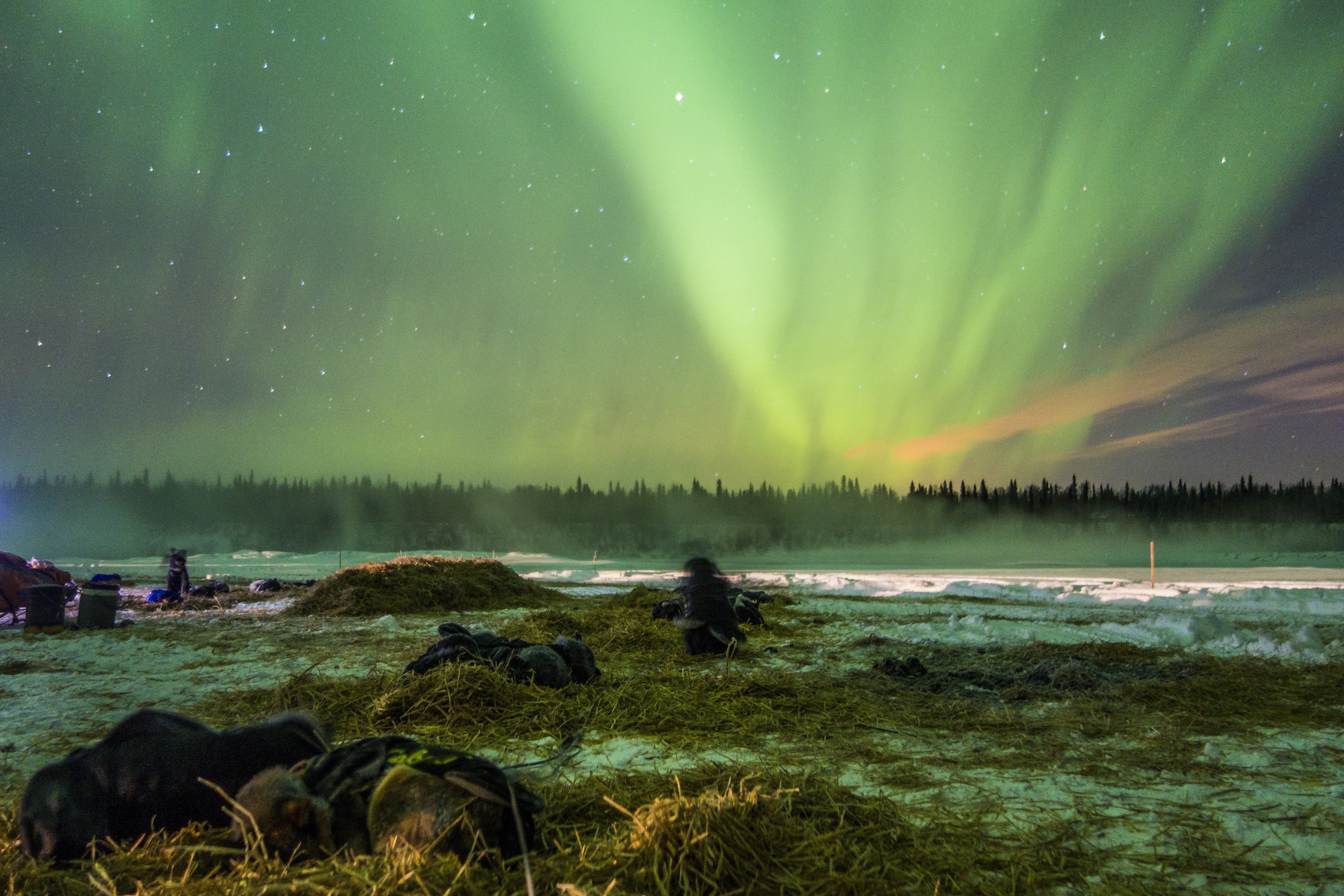 Northern lights over the Yentna River, Yentna Station checkpoint. [Photo by Tom Jamgochian]