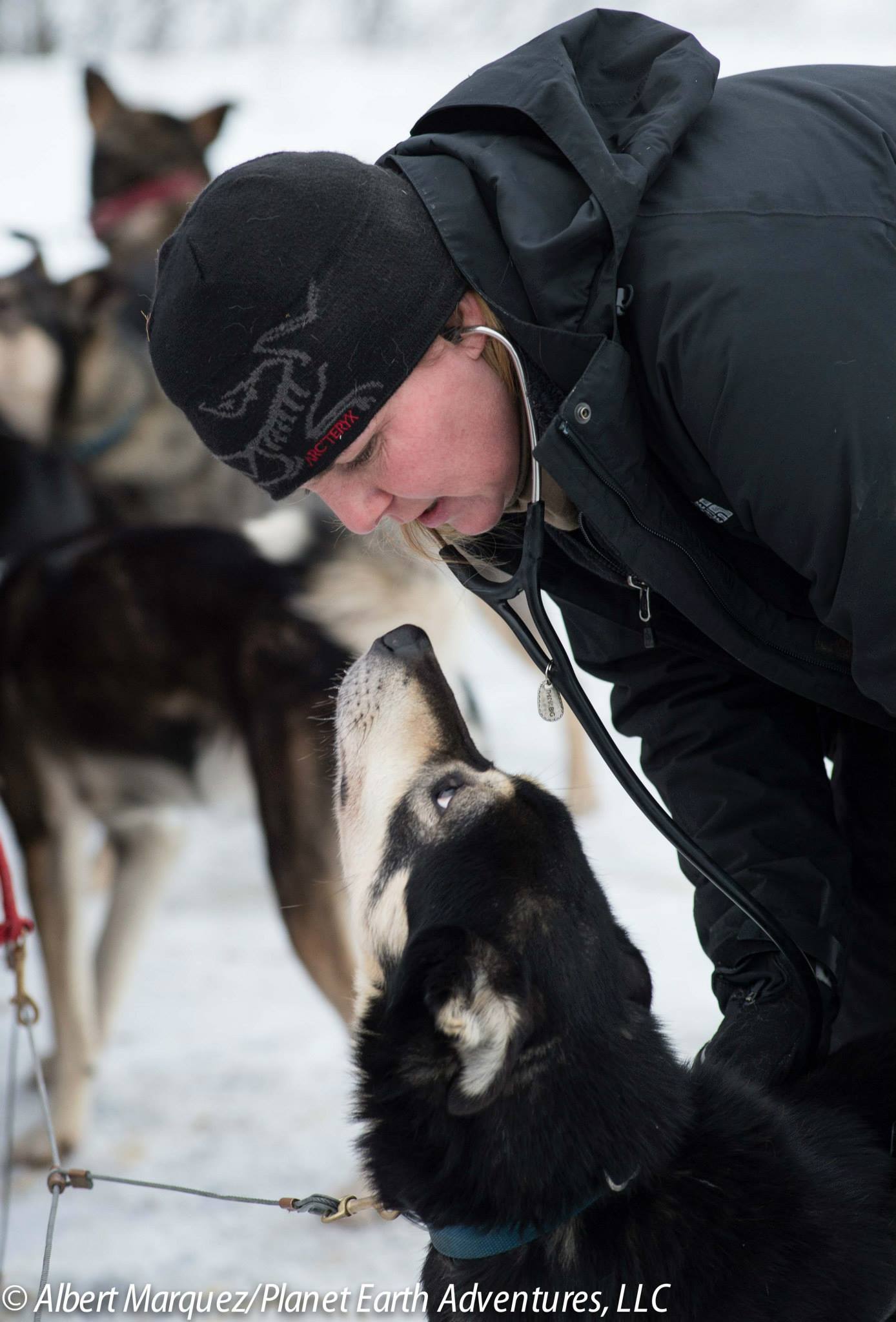 First place musher Kristy Berington gives one of her dogs a kiss. [Photo by Albert Marquez/Planet Earth Adventures]